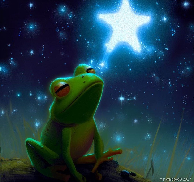 Es war einmal ein kleiner Frosch namens Ferdinand, der Tag für Tag mit geschlossenen Augen durch die Welt hüpfte. Während andere Frösche Insekten fingen und Krokodilen auswichen, verbrachte Ferdinand seine Zeit in einer Traumwelt voller Wunder und Abenteuer. Sein Lieblingsort in seinen Träumen war der Himmel, wo die Singenden Sterne ihre geheimnisvollen Lieder sangen.![]()